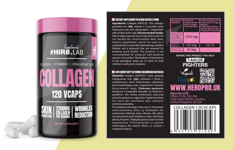 Collagen od firmy Hiro.Lab to solidny suplement, który zawiera kolagen rybi poprawiający nawilżenie skóry, która dzięki temu jest bardziej elastyczna i odporna na przesuszanie. Dbając o odpowiednie nawilżenie skóry wspieramy redukcję zmarszczek, a dzięki kolagenowi skóra odzyskuje blask i zdrowy wygląd. W produkcie od Hiro.Lab znajdziesz wysokiej jakości kolagen pochodzący z ryb, kwas hialuronowy oraz witaminę C, które wspierają naturalną produkcję tego składnika przez organizm. Właściwy poziom kolagenu wpływa pozytywnie na wzmocnienie kondycji włosów i paznokci, dzięki czemu są mniej łamliwe. Kolagen dodatkowo wpływa pozytywnie na zdrowie kości, ścięgien i stawów.